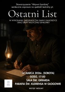 Stowarzyszenie „Aktywni bardziej” z Gaworzyc zaprasza na poruszające przedstawienie teatralne: pt. “Ostatni List”, które opowiada historię polskich oficerów, profesorów, nauczycieli, którzy w 1940 r. zostali zamordowani w Katyniu. Spektakl będzie wystawiony w sobotę o godz. 17:00 w auli św. Gerarda;