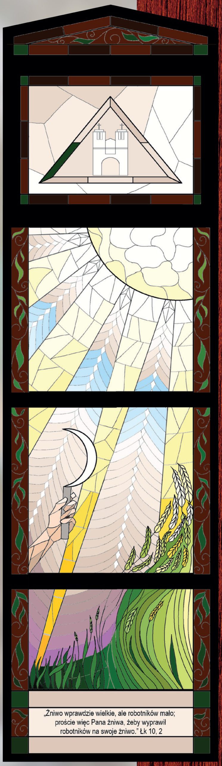 Tu połączyłam dwa obrazy, czyli praca przy plonach oraz słońce i księżyc. Ten ostatni, wyraża udział każdego księdza w kapłaństwie Jezusa, jedynego Kapłana. Podobnie jak księżyc nie świeci własnym światłem ale odbija światło słońca, tak też kapłani posługują kapłaństwem Jezusa. Opierając się o Jego słowa „żniwo wprawdzie wielkie ale robotników mało, proście więc Pana żniwa, aby wyprawił robotników na swoje żniwo.” połączyłam sierp księżyca z sierpem-narzędziem, co ma symbolizować troskę każdego kapłana o zbawienie powierzonych mu dusz. Wzrastający plon to oczywiście wierni, na różnym etapie rozwoju.